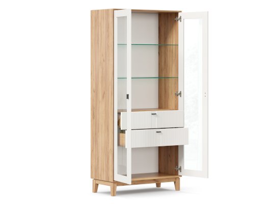 • За сборными распашными дверями со стеклом две стационарные горизонтальные перегородки и две съемные стеклополки.