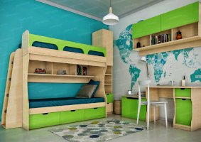 Атмосферу счастья и беззаботности приносит в дом детская «Киви». Сочетание оттенков лайм и дуб молочный выглядит очень жизнерадостно. Малышам нравится отдыхать и играть в такой комнате. Они с удовольствием спят на двух- или одноярусной кровати, хранят вещи в шкафу и на стеллажах, убирают игрушки в специальную тумбу и учат уроки за удобным письменным столом.