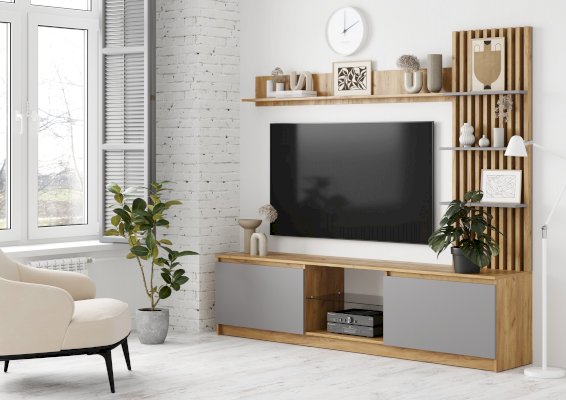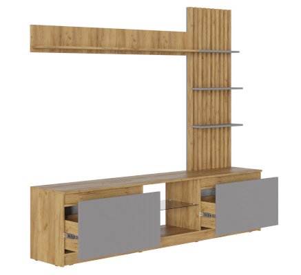 • Ниша под телевизором оборудована стеклополкой из тонированного стекла в цвете Графит, края обработаны еврокромкой
