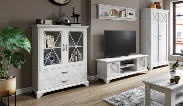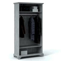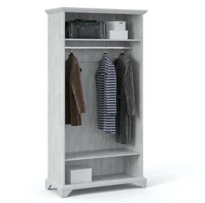 Распашной двухдверный шкаф выполнен в популярном стиле неоклассика – белые рамочные фасады с фактурой и рисунком натурального дерева, декоративные крестообразные накладки, фигурные ножки и карниз все это придает комнате элегантный и светлый вид. Вместительное отделение с полками поместит в себя одежду, коробки с обувью и головные уборы. Мебель выполнена из экологичных материалов.