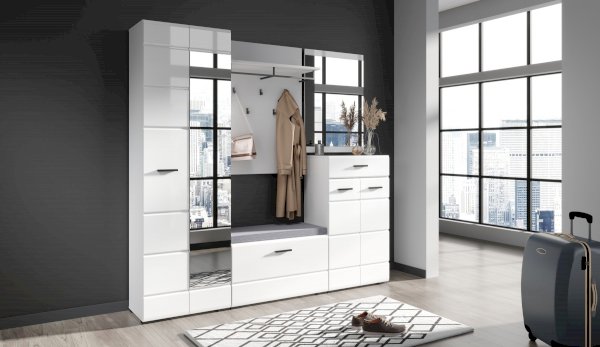 Компактный шкаф Йорк – это решение для небольшой спальни, гостиной или прихожей. Он выполнен в современном стиле – сочетает в себе функциональность и эффектный внешний вид: горизонтальная фрезеровка фасадов, контрастные черного цвета ручки и задняя стенка из ХДФ. Глянцевые белые фасады High Gloss из МДФ и зеркало в полный рост наполняют помещение светом, делают его воздушнее. Внутри предусмотрены секции для белья и отделение со штангой. Идеально компонуется со всеми модулями системы Йорк.