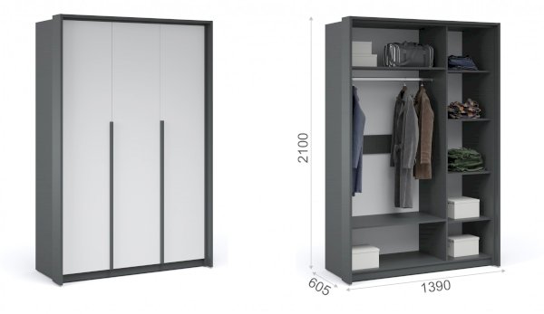 Функциональный распашной щкаф с массивными ручками контрастного цвета включает в себя вместительные полки и отделения со штангой, что позволяет создать систему для хранения вещей различного назначения. Встраиваемая в портал LED подсветка – оригинальное дизайнерское решение и дополнительный источник освещения. Современные цвета декора корпуса и белоснежный фасад добавят в жилое помещение света, уюта и комфорта. Идеально компонуется со всеми модулями системы Мишель.