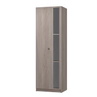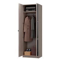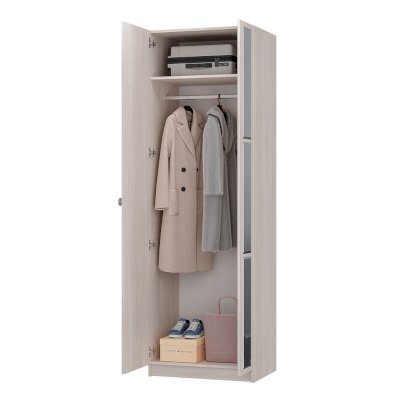 Данный шкаф имеет две распашные створки: на одной наклеены 3 зеркала с фацетом, вторая створка глухая. Данная модель идет в комплекте со штангой. По желанию, Вы можете заменить штангу полками. Полки приобретаются отдельно.