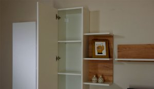 Стенка Невио-2 выполнена с использованием новейшего декора «Дуб крафт золотой» в сочетании с белым - подходит для стилистических направлений лофт, минимализм, скандинавский. Простые формы, естественные природные оттенки создают гармоничную и умиротворенную атмосферу гостиной. Четкая текстура дерева, белый цвет, отсутствие внешней фурнитуры, углубленный цоколь - создают визуальную легкость и компактность стенки. Фасады, выступающие на 1см поверх корпуса, заменяют ручки. Стенку дополняет вместительный комод с витриной. Мебель выполнена из высококачественных экологичных материалов.