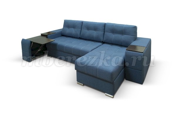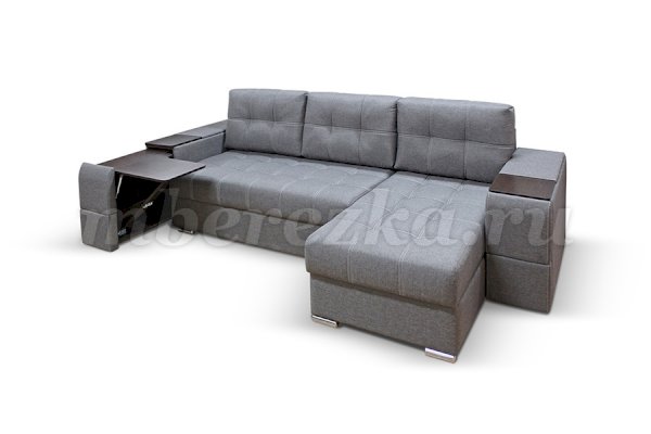 Угловой диван со столиком и выдвижными ящиками в подлокотниках «РИФ» завоевал среди покупателей большую популярность. Такая мебель значительно экономит пространство в помещении и, несомненно, делает отдых на диване комфортнее, ведь буквально под рукой есть раскладной столик в подлокотнике, на который можно поставить бокал, положить книгу или журнал, удобен при работе с ноутбуком. Другой подлокотник оборудован выдвижными полочками для хранения различных вещей. Большой ящик для белья внутри дивана, простой, и надежный механизм трансформации «тик-так» подтверждают функциональность этой модели. Блок независимых пружин, прошивка на сиденье – гарантия длительной эксплуатации дивана.