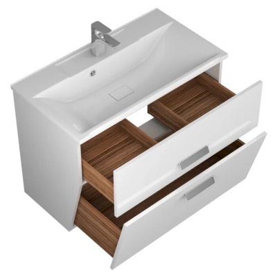 Подвесная тумба Veneciana Fabia с корпусом из влагостойкой ЛДСП и фасадом из МДФ, покрытых белой глянцевой эмалью. Ящики цвета «зебрано». Система направляющих Hettich скрытого монтажа обеспечивает плавное закрывание, защищая корпус и фасад от возможных повреждений. В верхнем ящике предусмотрено ограждение для сифона, пространство нижнего ящика полностью свободно для использования. Цвет ручек хром.