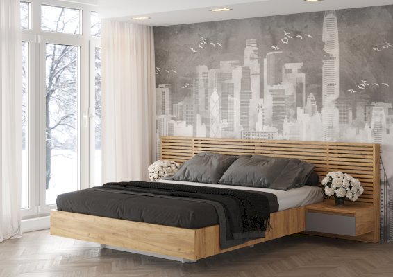 Спальный комплект состоит из кровати и двух тумб