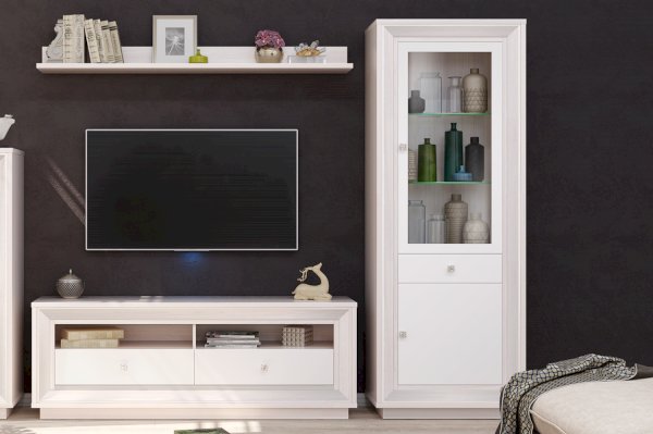 • при покупке мебели в гостиную важна функциональность и универсальность, благодаря наличию стеклодвери, глухого отделения и ящика такая модель может выполнять сразу несколько задач;
