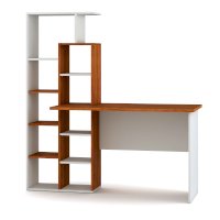 Компьютерный стол, комбинированный с открытой стеллажной системой, позволяет создать удобное и функциональное рабочее место на минимальной площади. На широкой прямой столешнице комфортно помещается ноутбук или планшет; при необходимости за столом можно работать с бумажными документами. Стеллаж заполняется книгами, учебниками, компьютерными принадлежностями, сувенирами. Простые формы оживляются контрастным сочетанием декоров – белый цвет и имитация натурального дерева. Модель предназначена для современных интерьеров.